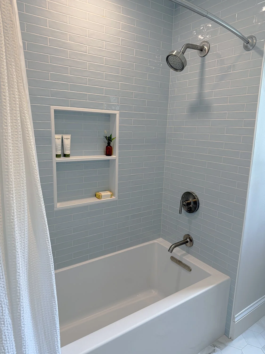 When you walk into the bathroom, there is a tub/shower combo to the left. Our client used to have a metal corner towel for storage as well as a small niche on the long wall. We replaced this with one two tier shower niche.