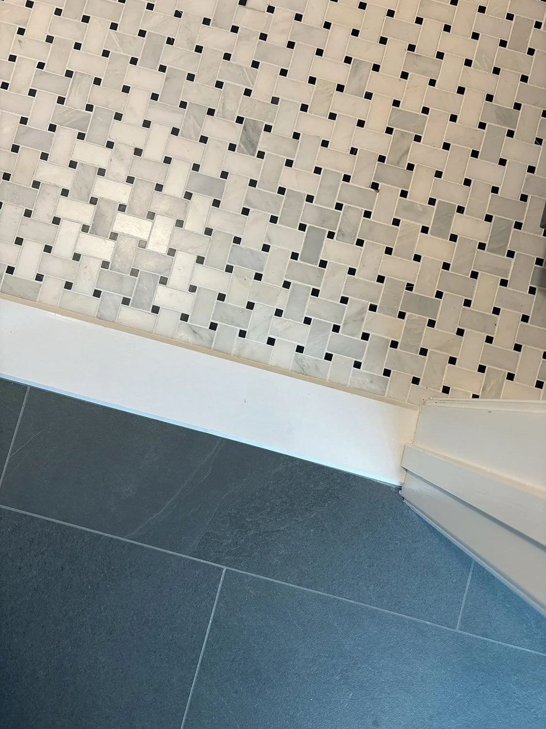 The floor tile is a classic basketweave in white and charcoal gray marble. The dark parts of the tile visually tie this finish into the mudroom floor.