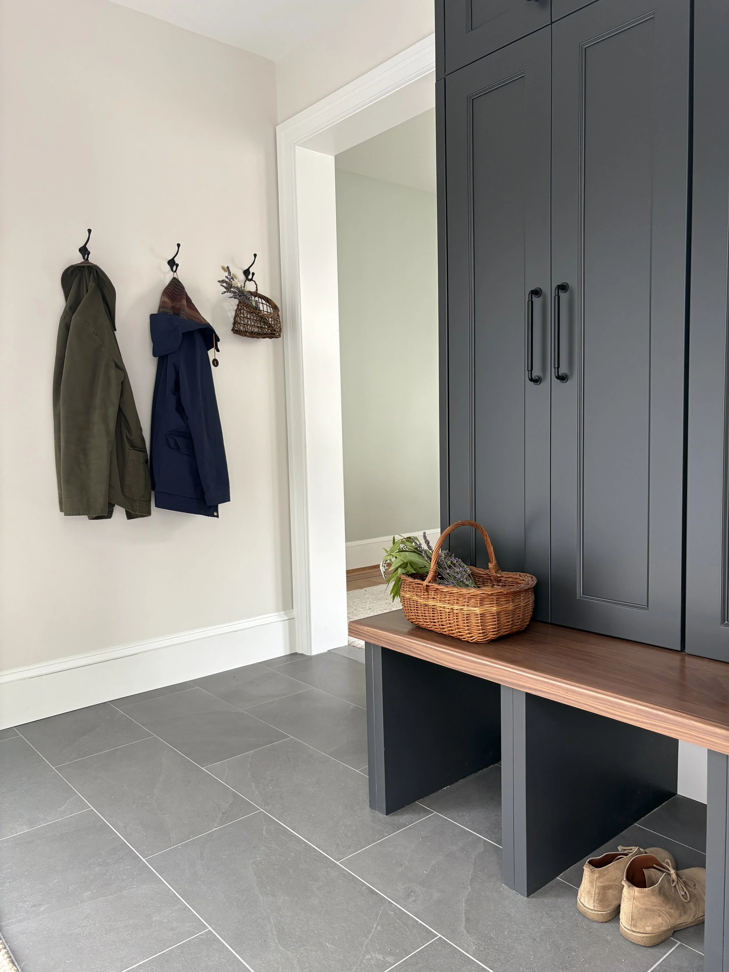 We still kept coat hooks on the perpendicular wall, but updated them with matte black double hooks to match the hardware in the rest of the space.