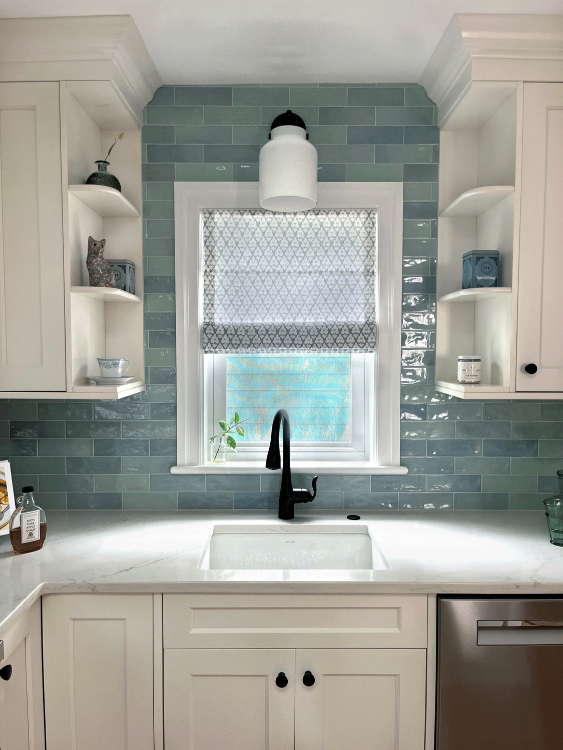 Previously, the client had mid-toned, cabinetry with dark countertops. The new white cabinetry is offset by a vibrant, high variation ocean blue backsplash. We had this modern subway tile installed in a traditional running bond pattern. A roman shade window treatment in a light blue patterned fabric provides a soft contrast to all the hard materials on this wall.